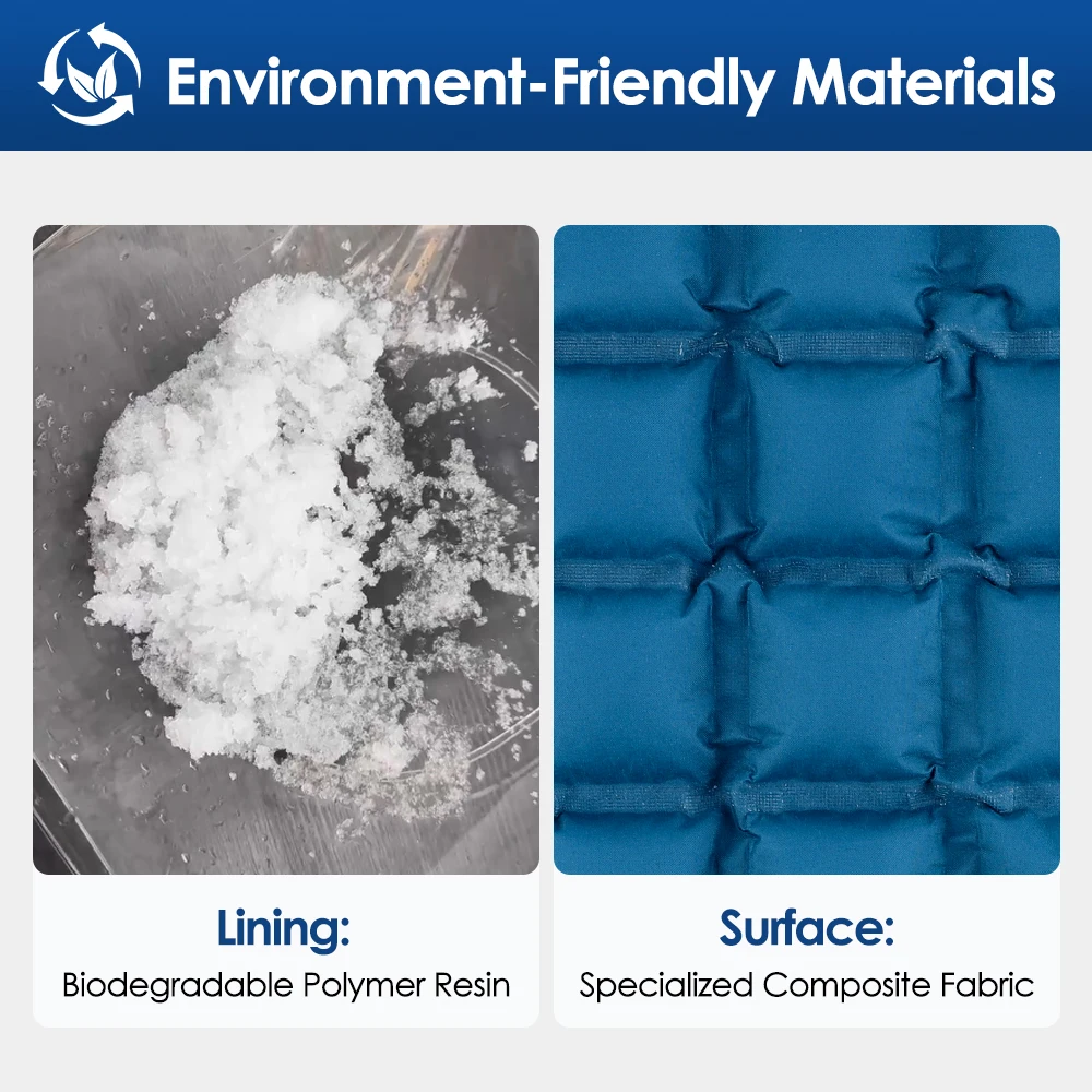 1. This reusable ice pack features a self-absorbing polymer resin fabric that is shipped completely dry. Simply soak it to absorb water, which reduces its shipping weight for easier storage and transport.